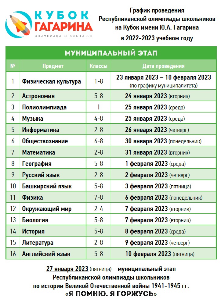 График проведения муниципального этапа Олимпиады школьников на Кубок имени Ю.А. Гагарина 2022-2023