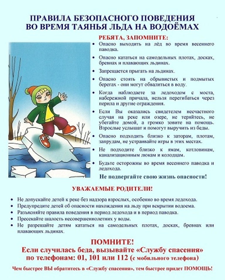 Не допускайте детей к реке без надзора взрослых, особенно во время ледохода; предупредите их об опасности нахождения на льду при вскрытии реки. Расскажите детям о правилах поведения в период паводка, запрещайте им шалить у воды, пресекайте лихачество. Оторванная льдина, холодная вода, быстрое течение грозят гибелью. Помните, что в период паводка, даже при незначительном ледоходе, несчастные случаи чаще всего происходят с детьми. Разъясните детям меры предосторожности в период ледохода и весеннего паводка.
